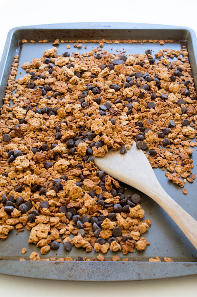 - Bake for 15 minutes and allow the granola to cool. The granola with get crunchier as it cools it tends to be sort of soft when it first comes out of the oven. Toss cooled granola with chocolate chips and enjoy.